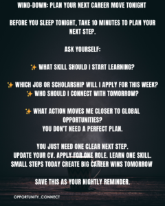The truth is simple: you don’t need five years to change your career direction. Sometimes, you only need 10 intentional minutes before sleep to move closer to your dream job, scholarship, or relocation opportunity.